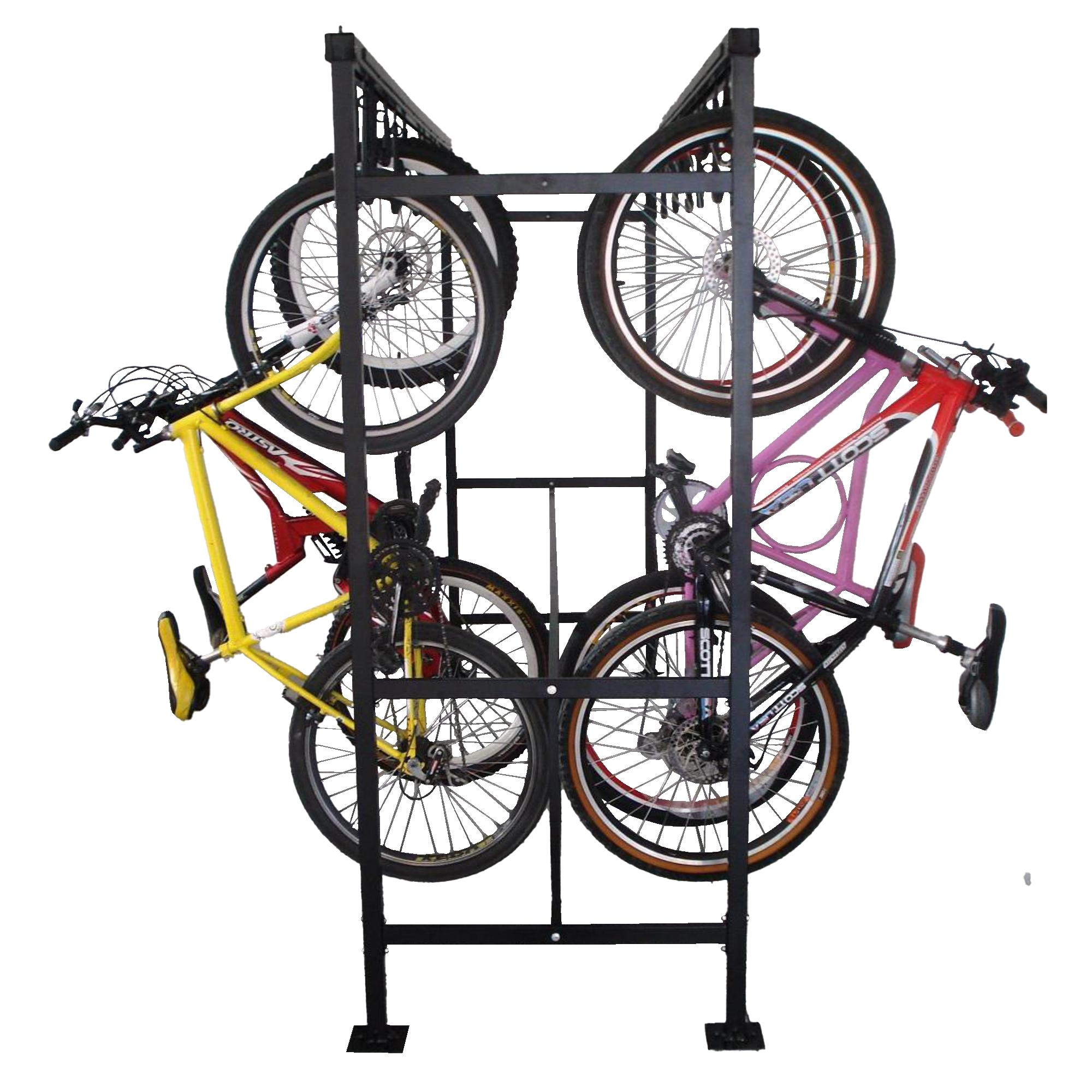 A altura dos ganchos intercalam para não haver contato com as bikes;